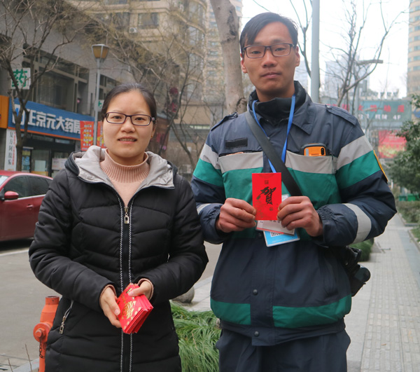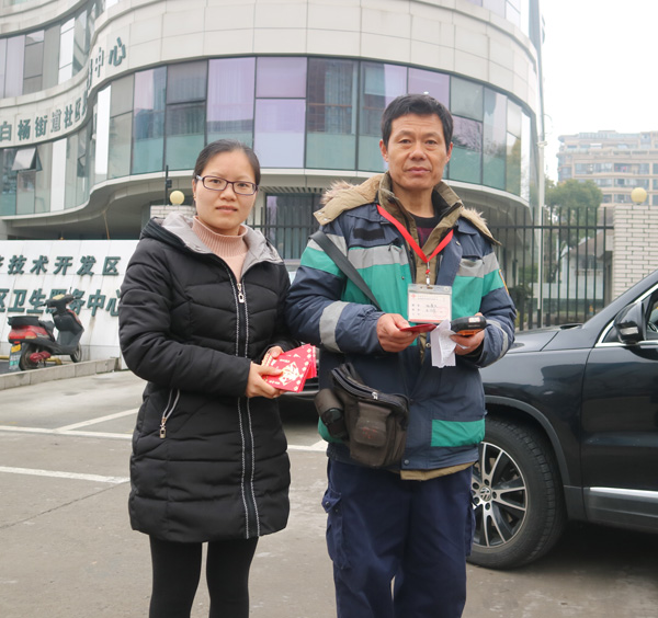 開年第一天上班,公司領導給奮戰在一線的停車收費員發開門紅包