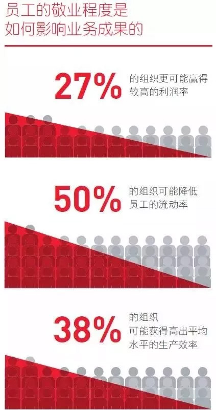 Gallup(蓋洛普咨詢公司)通過廣泛調研發現,那些最具敬業精神的工作場所中,27%的工作場所可能贏得更高的利潤率,50%員工流動率可能降低,38%的生產效率可能高于平均水平。人力資本管理(HCM intelligence)出版商PWC Saratoga調研表明,一家公司每10名專業員工離職,其平均損失可達100萬美元。渙散的員工會離開,甚至可能更糟的是,他們終日無所事事,進而將負面情緒傳播到周圍所有人身上。