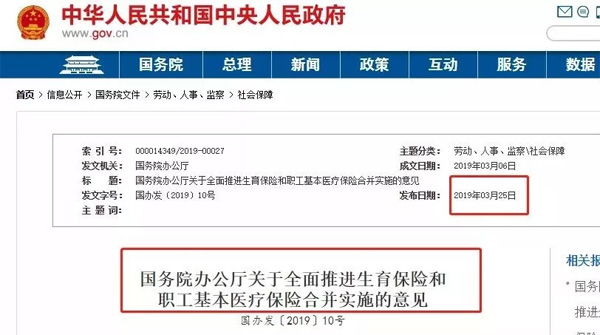 2019年3月月15日,國務(wù)院正式發(fā)布《關(guān)于全面推進(jìn)生育保險和職工基本醫(yī)療保險合并實施的意見》(國辦發(fā)〔2019〕10號),意見指出,2019年底前實現(xiàn)兩項保險合并實施。