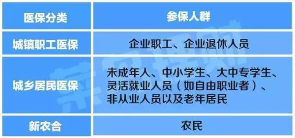醫(yī)保分為城鎮(zhèn)職工醫(yī)保與城鎮(zhèn)居民醫(yī)保,而城鎮(zhèn)居民醫(yī)保中又包含了城鄉(xiāng)居民醫(yī)保與新農(nóng)合,分別對應(yīng)著不同的參保人群。