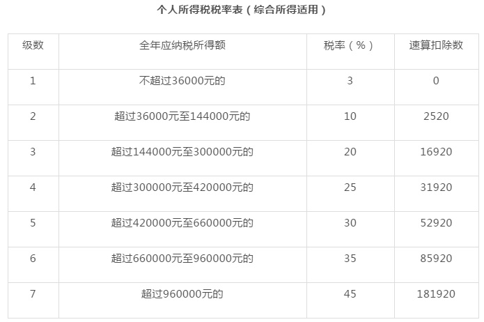 2019年度匯算應(yīng)退或應(yīng)補稅額=[(綜合所得收入額-60000元-“三險一金”等專項扣除-子女教育等專項附加扣除-依法確定的其他扣除-捐贈)×適用稅率-速算扣除數(shù)]-2019年已預(yù)繳稅額個人所得稅稅率表。
