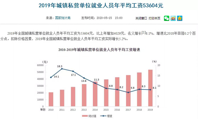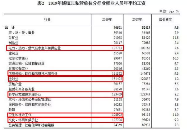 據(jù)統(tǒng)計(jì)局?jǐn)?shù)據(jù):2019年全國(guó)城鎮(zhèn)非私營(yíng)單位就業(yè)人員年平均工資為90501元,比上年增長(zhǎng)9.8%,扣除價(jià)格因素,實(shí)際增長(zhǎng)6.8%;城鎮(zhèn)私營(yíng)單位就業(yè)人員年平均工資為53604元,比上年增長(zhǎng)8.1%,扣除價(jià)格因素,實(shí)際增長(zhǎng)5.2%。 大家需要注意的是,非私營(yíng)單位并非就是國(guó)企。而是指:國(guó)有企業(yè),外資企業(yè),港澳臺(tái)資企業(yè),股份制公司和集體企業(yè)。非私營(yíng)單位≠體制內(nèi)單位。簡(jiǎn)單說(shuō)非私營(yíng)單位指國(guó)有單位+大中型公司,像我們耳熟能詳?shù)尿v訊阿里巴巴小米、蘋(píng)果三星中石油都屬于統(tǒng)計(jì)概念里的“非私營(yíng)單位”。 01 數(shù)據(jù)中的四大變化 從數(shù)據(jù)上看,2019年的數(shù)據(jù)有如下主要變化:城鎮(zhèn)非私營(yíng)單位年平均工資超過(guò)9萬(wàn)元;其中IT業(yè)年平均工資超16萬(wàn)元,連續(xù)4年雄踞第一;曾經(jīng)的高富帥行業(yè)金融業(yè)被“科學(xué)家們”反超,淪為第三;6大行業(yè)年平均工資超10萬(wàn)元。 變化1、城鎮(zhèn)非私營(yíng)單位年平均工資超9萬(wàn)元,城鎮(zhèn)私營(yíng)單位就業(yè)人員年平均工資超5萬(wàn)元。 據(jù)中國(guó)勞動(dòng)學(xué)會(huì)特約研究員蘇海南此前對(duì)中新網(wǎng)記者分析,非私營(yíng)單位包括國(guó)企、外企等,大中型企業(yè)居多,效益比較好,而私營(yíng)企業(yè)多數(shù)是勞動(dòng)密集型中小企業(yè),勞動(dòng)生產(chǎn)率低于非私營(yíng)企業(yè),勞動(dòng)者議價(jià)能力也不強(qiáng),導(dǎo)致工資水平明顯低于前者。 變化2、6大行業(yè)年平均工資超10萬(wàn)元。 總體來(lái)看,在城鎮(zhèn)非私營(yíng)單位中,有6個(gè)行業(yè)的年平均工資水平超過(guò)了10萬(wàn)元大關(guān),比2018年增加了2個(gè)。
