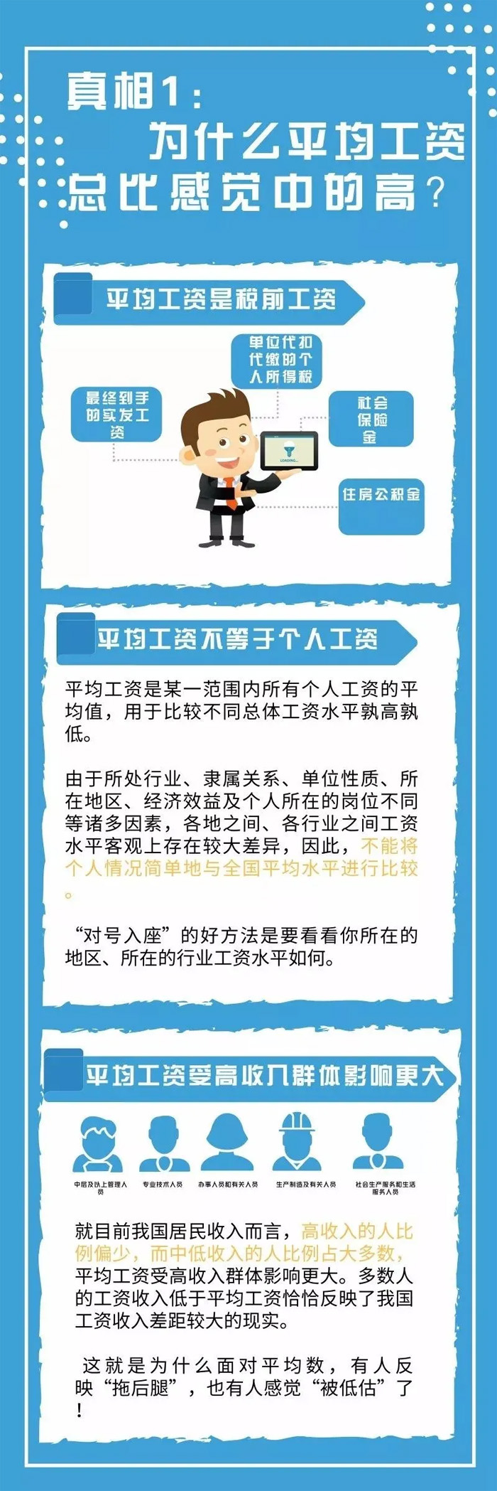 此外,平均工資還能帶來(lái)其它的幾點(diǎn)影響: 1、影響經(jīng)濟(jì)補(bǔ)償金月工資上限根據(jù)《勞動(dòng)合同法》相關(guān)規(guī)定,勞動(dòng)者月工資高于用人單位所在直轄市、設(shè)區(qū)的市級(jí)人民政府公布的本地區(qū)上年度職工月平均工資3倍的,向其支付經(jīng)濟(jì)補(bǔ)償?shù)臉?biāo)準(zhǔn)按職工月平均工資3倍的數(shù)額支付,年限最高不超過(guò)12年。 2、影響經(jīng)濟(jì)補(bǔ)償金免征個(gè)稅范圍根據(jù)國(guó)家稅務(wù)總局規(guī)定:對(duì)于“個(gè)人因與用人單位解除勞動(dòng)關(guān)系而取得的一次性補(bǔ)償收入(包括用人單位發(fā)放的經(jīng)濟(jì)補(bǔ)償金、生活補(bǔ)助費(fèi)和其他補(bǔ)助費(fèi)用),其收入在當(dāng)?shù)厣夏曷毠て骄べY3倍數(shù)額以?xún)?nèi)的部分,免征個(gè)人所得稅;超過(guò)的部分按照《國(guó)家稅務(wù)總局關(guān)于個(gè)人因解除勞動(dòng)合同取得經(jīng)濟(jì)補(bǔ)償金征收個(gè)人所得稅問(wèn)題的通知》的有關(guān)規(guī)定,計(jì)算征收個(gè)人所得稅。” 可以看到,平均工資所帶來(lái)的影響是很大的,這也就說(shuō)明了每次平均工資一公布,大家反響都很熱烈的原因。 03 關(guān)于平均工資,還有幾點(diǎn)小提醒 關(guān)于平均工資,還有幾點(diǎn)小提醒,可以解決小伙伴們又雙叒叕被平均的疑惑。 疑惑1 為什么大家都感覺(jué)拖后腿了?