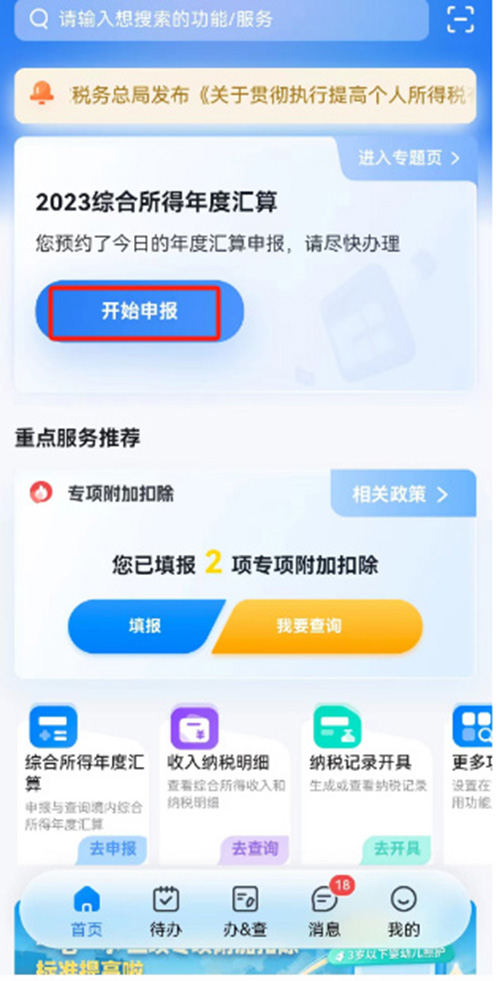 個稅匯算清繳具體操作 居民個人2023年度綜合所得年收入額超過6萬元時,可以在3月1日至6月30日內,通過標準申報辦理年度匯算。居民個人取得境外所得的,可到WEB端或辦稅服務廳辦理。 個稅APP標準申報操作步驟來了: 步驟一:開始申報 有預約的,可以在預約時間辦理,進入【個人所得稅APP】首頁,點擊【開始申報】開啟2023個稅匯算清繳。 沒有預約的,先進行預約。