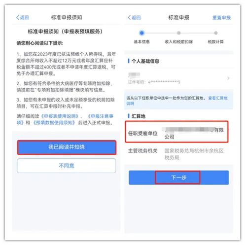 3月1日起,2023年度個稅綜合所得匯算開始。納稅人如需在3月1日至20日之間辦理匯算,可在2月21至3月20日(每日6:00-22:00)通過個稅APP預約。3月21日至6月30日,納稅人無需預約,可以隨時辦理。 步驟二、核對基礎信息、選擇匯繳地 2023年收入額大于6萬元的,系統(tǒng)會默認“標準申報”;如果2023年的收入額未超過6萬元且已預繳稅款,就會進入“簡易申報”流程,確認數(shù)據(jù)無誤后,提交即可。