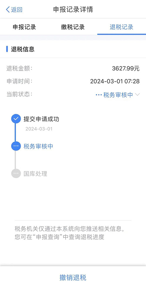 (2)申請退稅 若您存在多交稅款,可點擊【申請退稅】,稅務審核后會匯款給個人銀行卡。