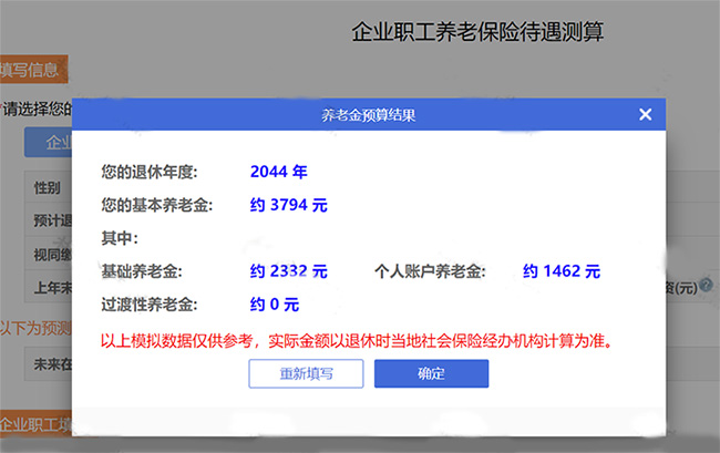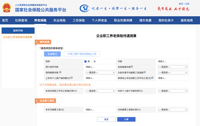 1、養(yǎng)老金測(cè)算公式 養(yǎng)老金計(jì)算公式:每月到手的養(yǎng)老金=月基礎(chǔ)養(yǎng)老金+月個(gè)人賬戶養(yǎng)老金 其中: (1)月基礎(chǔ)養(yǎng)老金=(全省上年度所有職工的月平均工資+本人指數(shù)化月平均繳費(fèi)工資)÷2×繳費(fèi)年限×1% (2)個(gè)人賬戶養(yǎng)老金=個(gè)人賬戶的余額÷計(jì)發(fā)月數(shù)(50歲為195、55歲為170、60歲為139) 2、月薪5000元,繳滿20年社保 退休能領(lǐng)多少養(yǎng)老金? 假設(shè)某位青島月薪5000元的男性,43歲才開始繳納社保,到63歲退休時(shí)正好繳滿20年。那他退休后能拿到多少養(yǎng)老金? 根據(jù)顯示,2023年度青島的平均工資為7910元/月。 另外,還需要假設(shè)幾個(gè)參數(shù),工資增長(zhǎng)率和個(gè)人賬戶記賬利率,通常都填入3%,方便計(jì)算器計(jì)算。 注:這個(gè)是預(yù)估數(shù)據(jù),實(shí)際情況可能會(huì)有差別 現(xiàn)在,我們根據(jù)上面的基礎(chǔ)信息,一起來(lái)算一算: 第一步:登錄“國(guó)家社會(huì)保險(xiǎn)公共服務(wù)平臺(tái)”,找到“養(yǎng)老保險(xiǎn)—企業(yè)職工養(yǎng)老保險(xiǎn)待遇測(cè)算”。