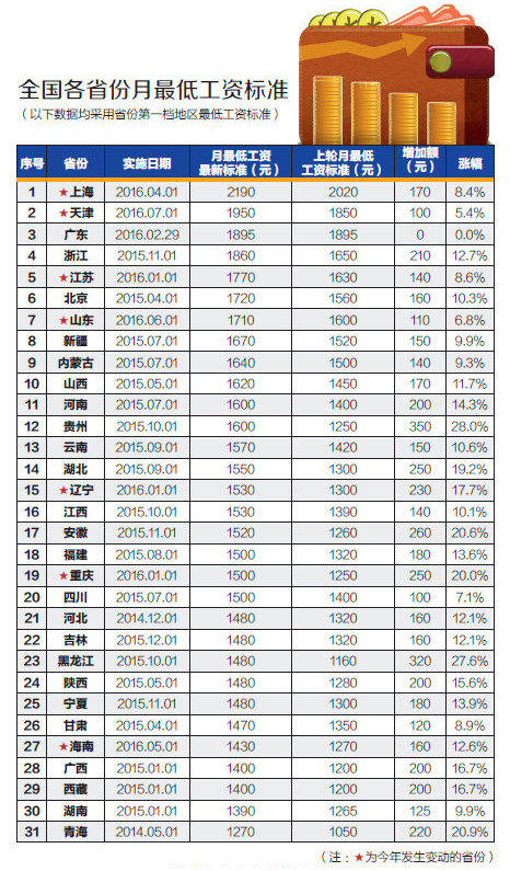 你所在的省份最低工資標(biāo)準(zhǔn)還調(diào)整嗎?凡是跟錢有關(guān)的政策調(diào)整很多人都很關(guān)注。據(jù)記者查閱公開報(bào)道統(tǒng)計(jì),截至5月26日,全國(guó)已有山東、上海、天津、江蘇、遼寧、重慶、海南等7省份對(duì)今年最低工資標(biāo)準(zhǔn)作了明確。 “在當(dāng)前經(jīng)濟(jì)增速明顯下滑的情況下,可以適當(dāng)減慢調(diào)整最低工資標(biāo)準(zhǔn)的次數(shù),合理降低最低工資標(biāo)準(zhǔn)調(diào)整的幅度”,中國(guó)勞動(dòng)學(xué)會(huì)副會(huì)長(zhǎng)蘇海南接受記者采訪時(shí)表示,“面對(duì)經(jīng)濟(jì)增速放緩的形勢(shì),為貫徹中央關(guān)于‘降成本’的要求,需要對(duì)現(xiàn)行有關(guān)規(guī)定和做法進(jìn)行研究調(diào)整。” 已有7省份上調(diào)最低工資標(biāo)準(zhǔn),最高最低省份差920元 截至5月26日,已有山東、上海、天津等7省份明確上調(diào)最低工資標(biāo)準(zhǔn),還剩24個(gè)省份未宣布上調(diào)最低工資標(biāo)準(zhǔn)(見圖表,標(biāo)紅五角星的是今年調(diào)整的省份)。而在過去的2015年,全國(guó)至少有28個(gè)地區(qū)上調(diào)最低工資標(biāo)準(zhǔn),上調(diào)的地區(qū)數(shù)量大大超過2014年。 目前,全國(guó)最低工資標(biāo)準(zhǔn)整體的狀況是:上海最低工資標(biāo)準(zhǔn)每月2190元,為全國(guó)最高,比位居第二位的天津高出240元,比位列第三位的廣東省高出295元;青海的最低工資標(biāo)準(zhǔn)為1270元,為全國(guó)最低。 上海的最低工資標(biāo)準(zhǔn)之所以拔得頭籌,似與經(jīng)濟(jì)總量相關(guān)。翻看上海市2015年的GDP總量接近2.49萬億元,比同為直轄市的北京(2015年的GDP總量為2.29萬億元)高出0.2萬億元,相應(yīng)的,最低工資標(biāo)準(zhǔn)也高出北京470元(北京2015年最低工資標(biāo)準(zhǔn)為1720元)。北京與上海的最低工資標(biāo)準(zhǔn)差距可謂不小。 而上海跟同為直轄市的天津相比,其最低工資標(biāo)準(zhǔn)差距卻沒有北京大。盡管天津2015年的GDP總量只有1.65萬億元,上海高出天津0.84萬億元,而天津2016年的最低工資標(biāo)準(zhǔn)為1950元,上海僅高出天津240元。 同為直轄市的重慶的最低工資標(biāo)準(zhǔn)就更不樂觀了。重慶2015年的GDP總量是1.57萬億元,經(jīng)濟(jì)體量與天津相當(dāng),與上海的差距為0.92萬億元,但是重慶2016年的最低工資標(biāo)準(zhǔn)僅為1500元,天津比重慶高450元,上海比重慶高690元。 如果簡(jiǎn)單地從經(jīng)濟(jì)總量數(shù)據(jù)上分析,與上海相比,北京、重慶的最低工資標(biāo)準(zhǔn)都還有上漲的空間。 其實(shí),上海不僅最低工資標(biāo)準(zhǔn)在全國(guó)拔得頭籌,最低工資標(biāo)準(zhǔn)的含金量也最高,這里說的含金量是指到手的純收入。上海明確規(guī)定,月最低工資標(biāo)準(zhǔn)不包含個(gè)人依法繳納的社會(huì)保險(xiǎn)費(fèi)和住房公積金;延長(zhǎng)法定工作時(shí)間的工資;中班、夜班、高溫、低溫、井下、有毒有害等特殊工作環(huán)境、條件下的津貼;伙食補(bǔ)貼(飯貼), 上下班交通費(fèi)補(bǔ)貼, 住房補(bǔ)貼。 值得注意的是,在榜單中,青海省的最低工資標(biāo)準(zhǔn)全國(guó)最低,為1270元,與最高的上海相差920元。查看2015年青海省的GDP總量為0.24萬億元,在全國(guó)排倒數(shù)第二,似乎最低工資跟當(dāng)?shù)氐慕?jīng)濟(jì)增速也密切相關(guān)。 對(duì)此蘇海南告訴記者,各省份在調(diào)整最低工資時(shí)不僅考慮經(jīng)濟(jì)增長(zhǎng)速度,還需綜合考慮包括物價(jià)上漲情況、社會(huì)平均工資提高以及就業(yè)狀況等多種因素。他同時(shí)建議,有條件的地方,還是要適時(shí)合理提高當(dāng)?shù)刈畹凸べY標(biāo)準(zhǔn),畢竟這與2013年出臺(tái)的《關(guān)于深化收入分配制度改革的若干意見》提出的要“促進(jìn)中低收入職工工資合理增長(zhǎng)”的說法相一致;但各地在調(diào)整最低工資標(biāo)準(zhǔn)時(shí),一定不能再像有的地方前幾年那樣去與周邊地區(qū)搞攀比,一定要把握好度,既要努力保障提供正常勞動(dòng)的低收入勞動(dòng)者實(shí)際生活不下降,同時(shí)要避免給企業(yè)形成過大壓力。