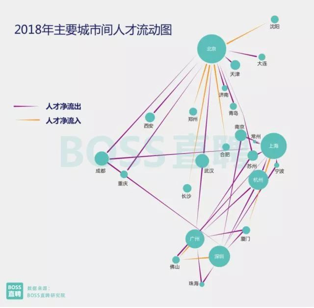 二三線城市勞動人口來源地域差異明顯 從一線城市人才流出方向來看,從北京離開的求職者,下一份工作的地區分散度最高,其范圍橫跨西南和東部沿海城市,幾乎輻射大半個中國。 而從上海、深圳和廣州離開的求職者,下一份工作地區集中度相對較高,超過60%的人選擇周邊二線/省會城市及珠三角地區。上海和廣州的區域輻射最為集中,深圳則呈現出和北 京相似的“全國撒網”式特點。