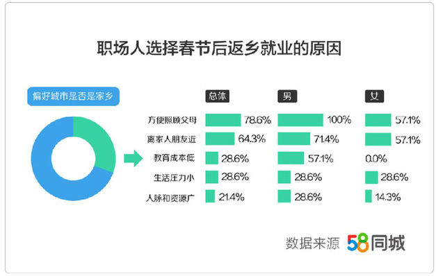 春節(jié)后,有30.4%職場(chǎng)人選擇回家鄉(xiāng)發(fā)展,其中,78.6%是為了回家照顧父母。此外,離家人朋友近、教育成本低、生活壓力小也是這些職場(chǎng)人選擇返鄉(xiāng)擇業(yè)的原因。