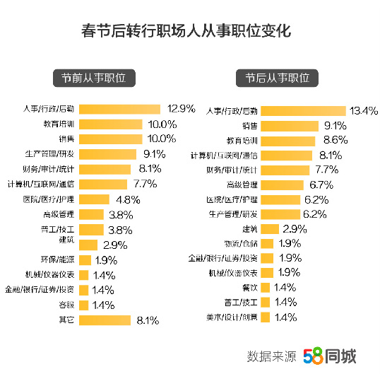 轉(zhuǎn)行偏愛銷售行業(yè),行政是換工作首選職位 據(jù)58同城調(diào)研數(shù)據(jù)顯示,春節(jié)前有轉(zhuǎn)行計(jì)劃的職場(chǎng)人從事的Top3行業(yè)分別是人事/行政/后勤、建筑、教育培訓(xùn),春節(jié)后職場(chǎng)人期望從事的Top3行業(yè)分別是銷售、人事/行政/后勤、金融/銀行/證券/投資。其中,有19.7%的職場(chǎng)人希望在春節(jié)后轉(zhuǎn)行進(jìn)入銷售行業(yè),春節(jié)前從事該行業(yè)的被訪者占比僅為6.6%。由于銷售行業(yè)屬于多勞多得的行業(yè),許多職場(chǎng)人希望通過從事這一行業(yè)來改善收入水平,在春節(jié)后獲得更高的收入。 從具體城市來看,一線城市職場(chǎng)人轉(zhuǎn)行的主要原因是為實(shí)現(xiàn)自我突破,以期得到更好的發(fā)展。一線城市職場(chǎng)人轉(zhuǎn)行更愿意從事銷售和金融等挑戰(zhàn)性大的行業(yè),新一線職場(chǎng)人更偏好選擇人事、銷售、教育等行業(yè)作為新的開始。