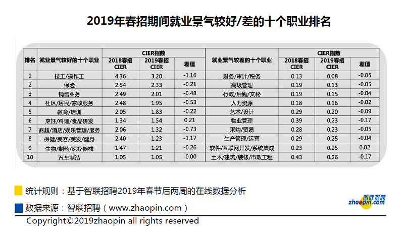 從求職端的數(shù)據(jù)來(lái)看,春招期間找工作的人數(shù)同比增加了4%,簡(jiǎn)歷投遞次數(shù)同比增加18%,這表明單個(gè)求職者較去年投遞了更多的簡(jiǎn)歷,且求職人數(shù)在增加,需求人數(shù)在減少的趨勢(shì)將整體影響今年春招的就業(yè)景氣度。 2019年春招期間就業(yè)景氣度低于去年 綜合供需兩端的情況,2019年春招期間的CIER指數(shù)降為1.55,較2018年的1.68略有下滑,證明今年春招期間的求職競(jìng)爭(zhēng)程度更激烈,平均一個(gè)求職者對(duì)應(yīng)1.55個(gè)用人需求。 二、東部就業(yè)形勢(shì)墊底,中介服務(wù)業(yè)的景氣度高居榜首 東部地區(qū)春招就業(yè)景氣度落后東北,一線城市競(jìng)爭(zhēng)依然激烈 數(shù)據(jù)顯示,2019年春招期間CIER指數(shù)仍呈現(xiàn)中部、西部、東北以及東部地區(qū)依次遞減的趨勢(shì)。同比來(lái)看,今年的CIER指數(shù)較去年均略有下滑,東部地區(qū)產(chǎn)業(yè)發(fā)展比較先進(jìn),人才競(jìng)爭(zhēng)也比較集中,因此春招旺季這一地區(qū)的就業(yè)壓力也是*大的,景氣度墊底。 從不同城市等級(jí)看,2019年春招期間CIER指數(shù)仍呈現(xiàn)一線、新一線、二線、三線及四線城市依次遞增的趨勢(shì)。其中,僅三、四線城市的CIER指數(shù)大于1,表明在這些城市中,企業(yè)招聘需求人數(shù)要大于求職申請(qǐng)人數(shù);一線、新一線、二線城市的CIER指數(shù)小于1,說(shuō)明企業(yè)招聘需求人數(shù)要小于求職申請(qǐng)人數(shù)。智聯(lián)招聘調(diào)研顯示,大多數(shù)求職者仍然希望在更大的城市就業(yè),因此大城市的競(jìng)爭(zhēng)也往往會(huì)更激烈。 中介服務(wù)業(yè)的景氣度高居榜首,傳統(tǒng)加工制造業(yè)轉(zhuǎn)型陣痛依然明顯 數(shù)據(jù)顯示,從2019年春季求職期間排名結(jié)果來(lái)看,就業(yè)形勢(shì)最好的行業(yè)是中介服務(wù)業(yè),CIER指數(shù)高達(dá)3.37,其次是保險(xiǎn)及外包服務(wù),CIER指數(shù)分別為1.81、1.70。服務(wù)業(yè)為代表的第三產(chǎn)業(yè)因?yàn)榉?wù)業(yè)的升級(jí)和社會(huì)轉(zhuǎn)型的需要,正在持續(xù)釋放需求,吸納就業(yè)的能力十分強(qiáng)大。值得注意的是,2019年春招期間,在就業(yè)形勢(shì)較好的前十大行業(yè)中,除了信托/擔(dān)保/拍賣/典當(dāng)和醫(yī)藥/生物/工程的CIER指數(shù)是高于2018年春季求職的,其他的行業(yè)的CIER指數(shù)都低于去年。 在就業(yè)景氣較差的行業(yè)中,2019年春招期間航空/航天研究與制造業(yè)的就業(yè)景氣程度最差,CIER指數(shù)僅為0.15,其次是能源/礦產(chǎn)/采掘/冶煉業(yè),為0.20,傳統(tǒng)加工制造業(yè)的就業(yè)形勢(shì)仍然堪憂,在去年備受關(guān)注的貿(mào)易/進(jìn)出口行業(yè),在春招旺季景氣度同比下行。