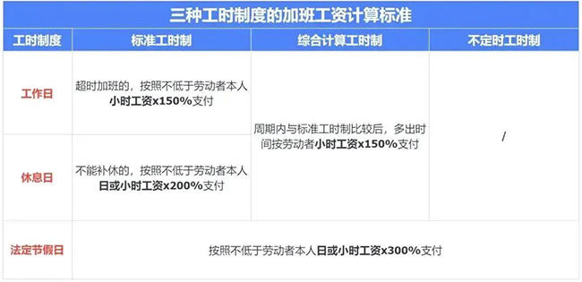 2、這幾天加班,發3倍工資 根據2024年11月修訂的《全國年節及紀念日放假辦法》,自2025年1月1日起,全體公民放假的假日(即通常所說的法定節假日、法定休假日)由11天增至13天(春節、勞動節各增加1天)。 全體公民放假的假日為: 元旦,放假1天(1月1日); 春節,放假4天(農歷除夕、正月初一至初三); 清明節,放假1天(農歷清明當日); 勞動節,放假2天(5月1日、2日); 端午節,放假1天(農歷端午當日); 中秋節,放假1天(農歷中秋當日); 國慶節,放假3天(10月1日至3日)。 依照《中華人民共和國勞動法》規定: 1、工作日超時加班的,加班工資不低于1.5倍; 2、休息日安排勞動者工作又不能安排補休的,支付不低于工資2倍的加班工資; 3、法定休假日安排勞動者工作的,支付不低于工資3倍的加班工資。 此外,法定休假日當天安排加班的,必須支付加班工資,不能以安排補休為由不支付加班工資。休息日安排加班的,有補休就不需要支付加班費;如果沒有補休,則需要支付200%的工資作為加班費。 采用非標準工時制的員工,加班工資計算標準可參考下表: