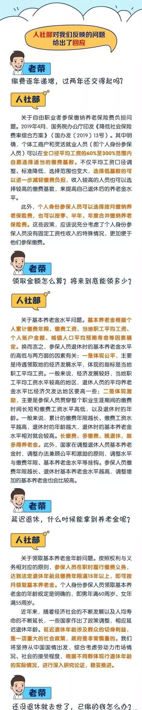 1、個人也可以參保 按照現行制度規定,各類企業及其職工必須參加企業職工基本養老保險,基本養老保險費由企業和職工共同繳納。 自由職業者、靈活就業人員等可以參保(以下簡稱“個人身份參保人員”),由個人繳納基本養老保險費,但并不是強制性的。 個人身份參保人員繳納養老保險費,原來的政策規定以當地上年度在崗職工月平均工資為繳費基數,繳費比例為20%,其中8%記入個人賬戶。 2、個人可自愿選擇適當的繳費基數 2019年4月,國務院辦公廳印發《降低社會保險費率綜合方案》。其中明確,個體工商戶和靈活就業人員(即個人身份參保人員)可以在全口徑平均工資的60%至300%范圍內自愿選擇適當的繳費基數。 不僅平均工資口徑調整、標準降低,選擇范圍也變大,選擇低基數的可以進一步減輕繳費負擔,收入較高的人員也可以選擇較高的繳費基數,來提高自己退休后的養老金水平。 3、可以選擇多種方式繳納養老保險費 個人身份參保人員可以選擇按月繳納養老保險費,也可以按季、半年、年度合并繳納養老保險費。 這些政策,應該說充分考慮了個人身份參保人員沒有固定工資性收入的特殊情況,更加便于他們參保繳費。 4、經濟發展較好地區養老金水平要高些 基本養老金根據個人累計繳費年限、繳費工資、當地職工平均工資、個人賬戶金額、城鎮人口平均預期壽命等因素確定。 換而言之,參保人員退休時的基本養老金水平的高低與兩方面的因素有關: 一是體現公平,主要是待遇領取地的經濟發展水平,體現的指標是當地職工平均工資。 一般來說,經濟發展較好,當地職工平均工資水平較高的地區,退休人員的平均養老金水平比經濟欠發達地區要高一些; 二是體現激勵,主要是參保人員貫穿整個職業生涯期間的繳費時間長短和繳費工資水平高低,以及退休時的年齡。 5、長繳費、多繳費、晚退休就多得養老金 一般來說,累計的繳費年限越長、繳費工資水平越高,退休時的年齡越大,退休時的基本養老金水平相對就會較高。 長繳費、多繳費、晚退休,就多得養老金。 此外,國家在調整退休人員基本養老金時,調整辦法兼顧公平和激勵的原則,調整水平與繳費年限、基本養老金水平等掛鉤。 參保人員繳費年限越長、退休時基本養老金水平越高,調整增加的基本養老金也會比較高。 延遲退休年齡涉及群眾的切身利益,是一項重大的社會政策,政府是非常慎重的。 6、退休人員無需顧慮個人賬戶儲存額剩余多少 應該說,符合條件的參保人員退休后,其基本生活是有保障的。 一是國家確?;攫B老金按時足額發放。 基本養老金由基礎養老金和個人賬戶養老金組成。其中,基礎養老金從養老保險統籌基金中列支;個人賬戶養老金,首先從個人賬戶儲存額中列支。當個人賬戶儲存額變為零時,其個人賬戶養老金從統籌基金中列支。 也就是說,退休人員無需顧慮個人賬戶儲存額剩余多少,國家將確保包括個人賬戶養老金在內的基本養老金按時足額發放,這正充分體現了我國企業職工基本養老保險制度的優越性,體現了政府的責任和擔當。 此外,國家政策還規定,參加養老保險的人員死亡的,其個人賬戶余額可以繼承。 現在全都看明白了吧,如果你有哪些看法也歡迎在評論區留言~ |